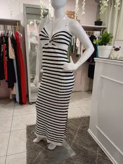 Vestido tejido rayado. 🤍Hermoso vestido tejido largo , con rayas negras y blancas. Los tirantes son ajustables. Tiene abertura en pierna izquierda🌸El vestido se ajusta al cuerpo y estira🍂Las medidas son ax a ax 39 CM, cintura 32 CM, largo 152 CM.