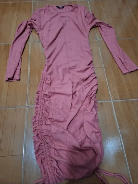 Vestido tejido rosa. Bonito vestido, no tiene ningún detalle y no transparenta nada, estira muchísimo por lo que queda a talla chica, medidas:Hombro 33cmLargo 110cmLargo de la manga 56cmCintura 59cmCadera 76.5