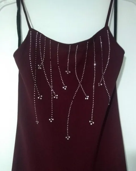 Vestido Tinto con Pedrería con tirantes delgados, no trae cierre ni botones, es muy angosto talla petit o XS, para una jovencita o alguien de talla muy pequeña, mide ancho Axila=43cm, ancho Cintura=42cm, ancho Cadera=49cm, Largo=116cm, Te regalo $100 con mi código de descuento si es tu primera compra iuNisj3oSQ