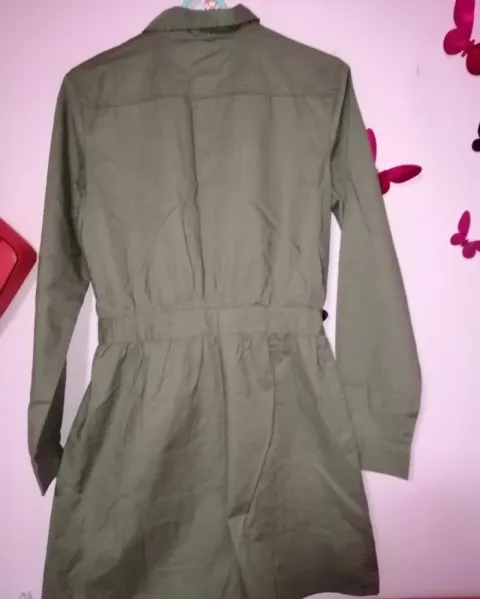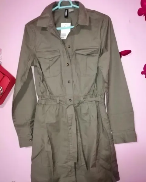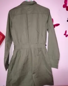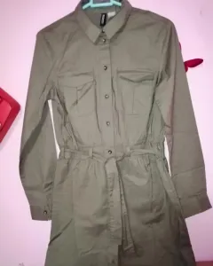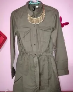 Vestido tipo camisero. Vestido tipo camisero, botones al frente y cinturon de la musma tela. Medidas de axila a axila 46 cm de cada lado, cintura 36 cm de cada lado cadera, 50 cm de cada lado. Largo total 86 cm. Es color verde militar. Es talla xch pero viene amplió le va bien a una talla ch o M delgada. EL COLLAR SÉ VENDÉ POR SEPARADO.