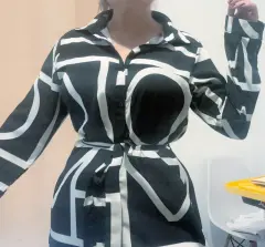 Vestido tipo camisola, elegante, suave y versátil. "¡Déjate envolver en elegancia y comodidad con nuestro vestido en tela fina y sedosa! Este hermoso vestido negro con patrones geométricos es fresco y se ajusta perfectamente a tu cuerpo gracias a su estilo camisola. Además, con su cinturón de tela a juego, puedes jugar con diferentes estilos atándolo por delante o por detrás. Ya sea con mangas largas o tres cuartos, los detalles de botones lo hacen versátil y perfecto para cualquier ocasión. ¡Haz una declaración de moda con este versátil y encantador vestido!"