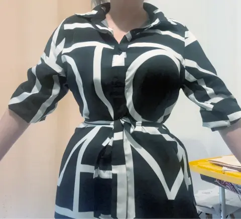"¡Déjate envolver en elegancia y comodidad con nuestro vestido en tela fina y sedosa! Este hermoso vestido negro con patrones geométricos es fresco y se ajusta perfectamente a tu cuerpo gracias a su estilo camisola. Además, con su cinturón de tela a juego, puedes jugar con diferentes estilos atándolo por delante o por detrás. Ya sea con mangas largas o tres cuartos, los detalles de botones lo hacen versátil y perfecto para cualquier ocasión. ¡Haz una declaración de moda con este versátil y encantador vestido!"