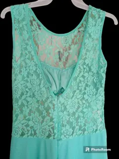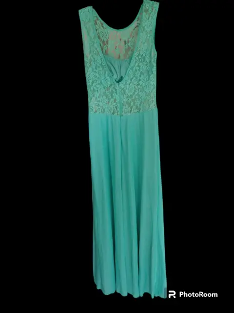 Vestido largo de tul color menta , espalda V , con encaje y tiene su top con almohadilla en los pechos. Una puesta