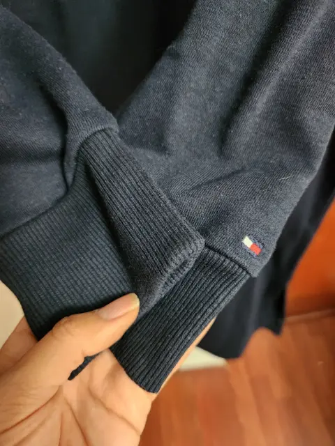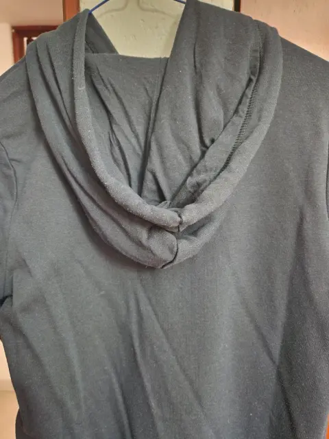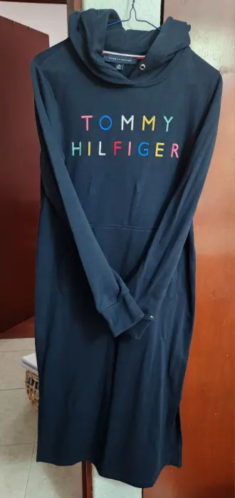 Vestido a mitad de pantorrilla (depende de altura), abertura al costadoNo es pegado pero si un corte recto, marca al frente en colores y bolsita tipo canguro Tiene capucha