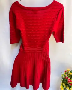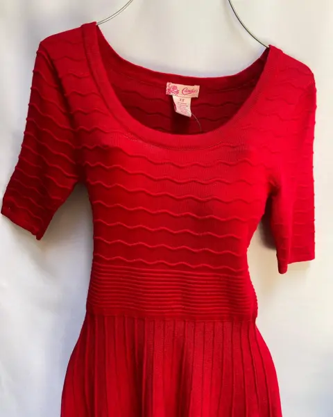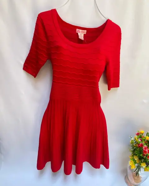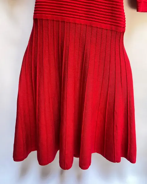 Vestido tipo suéter rojo carmín, EL COLOR REAL DE VESTIDO es el de la Primera Foto solo que la cámara lo cambia escote redondo con diferentes patrones en tela. En royón, poliéster y stretch. Mangas a los codos. Tiene una serie de rayas horizontales a la altura de cintura para una ligera compresión.Talla: XS (22-24) También puede quedar a una talla S. Marca: Candie’s.
