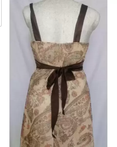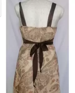 Vestido sin manga,cuello v,tela gasa estampada en color camel,con vistas lisas de satin color cafe. Talla L.