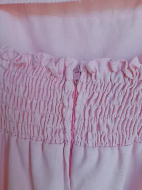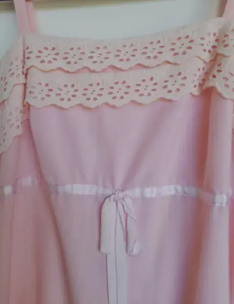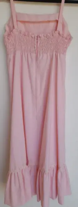 Vestido de tirantes rosa pastel, escote cuadrado, resorte español en la parte posterior, con tira bordada y listones. Olan en la parte inferior. Lo mas cute y femenino. Medida de axila a axila entre 32 y 35 cm por el resorte.Para esta época de calor, ropa de algodón.