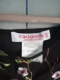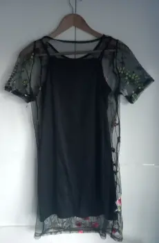 Vestido transparente. Vestido corto, doble tela, talla mediana, fondo negro y tela delgada con bordados encima