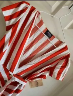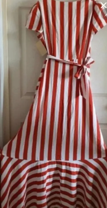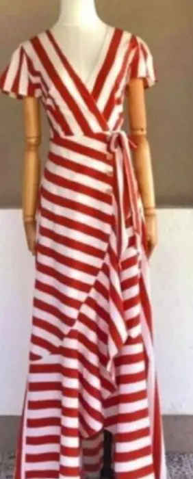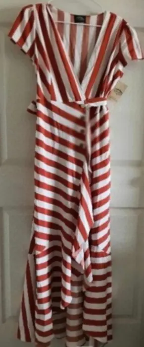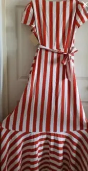 Vestido traslapado rayado. Vestido blanco con rayas color rojo ladrillo, escote profundo en V, tiene amarre con cinturón de la misma tela, abertura en piernas, un estilo único y moderno. Manga corta. Talla G, medidas de lado a lado: hombros 40cms, axila 55cms, cintura 45cms, largo parte trasera 150cms y delantera asimétrico, lo mas corto del olán 110cms. Super hermoso ❤️🔥❤Marca Marie Herz