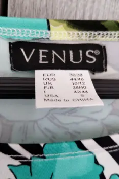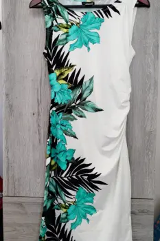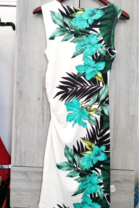 Bonito vestido entallado elegante.Temática tropical.Talla S// Americano// Marca VenusTela stretch y gruesa.Una puesta- 0 detalles.Composición 92% Poliéster // 8% spandex-elastano