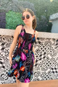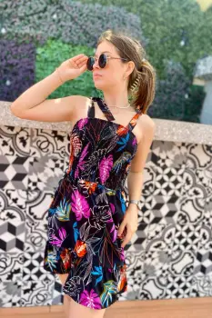 Vestido tropical negro. Esta hermoso, Super fresco e ideal para estos calores. La tela del pecho es elástica. Se amarra de los tirantes a tu nivel. Es unitalla queda como a una talla Chica porque viene reducido