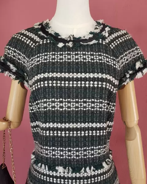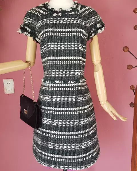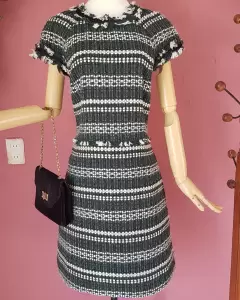 Vestido tweed con lentejuela. Hemoso vestido tweed verde/blanco. Em cuello y manga tiene lentejuela negra 😍 Marca Tory Burch. En excelente estadoTalla 12Medidas (lado a lado):Busto 49cmCintura 44cmCadera 56cmLargo 94cm