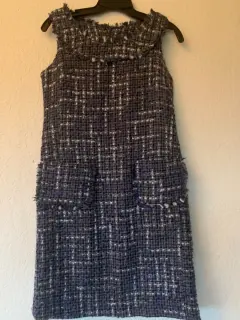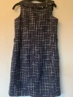 Vestido tweed gris. Vestido de tweed , sin mangas , diseño cuadriculado (azul, gris , negro), con cierre en la espalda y detalle de bolsillos al frente, talla 7 , marca FOLEYS joy