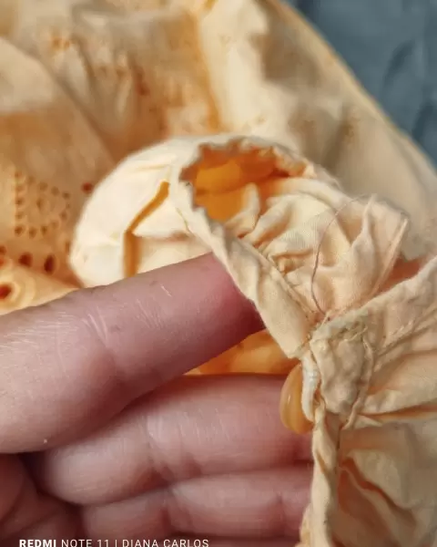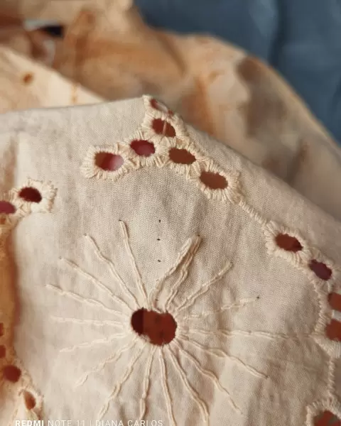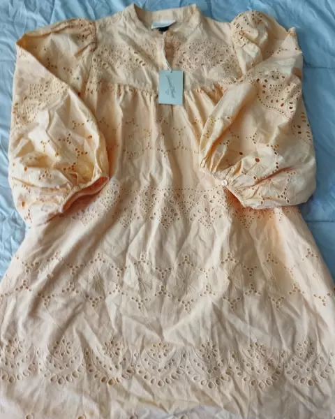 Vestido en tela de algodón, con forro, 34" de largo, con botones en las mangas.Tiene 2 ligeros detalles de los cuales anexe foto.