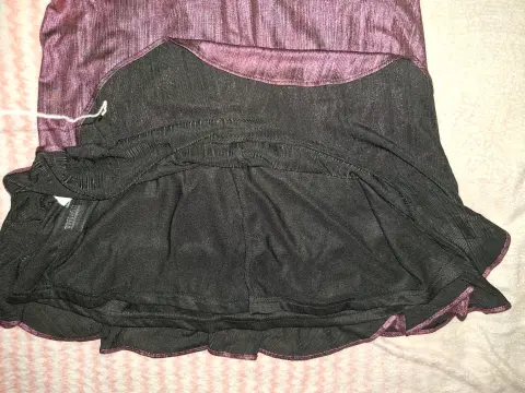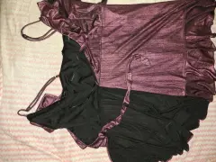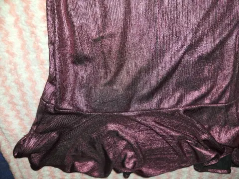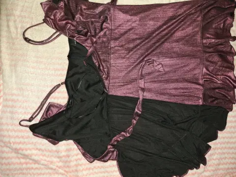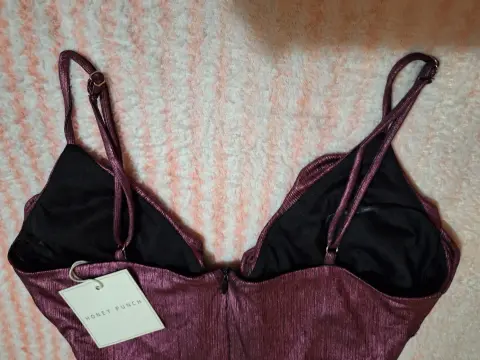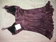 Hermoso y sexy vestido color uva satinada, de tirantes ajustables, tiene algo de vuelo, se abrocha con cierre y un broche hasta arriba. Tiene olanes y se cierra de manera cruzado con una cinta. Tiene un detalle en la parte de atrás de la falda, tenía una rasgada pero lo arregle con un pequeño parche (como se ve en las últimas dos fotos), al momento de usarlo no se nota. Tiene forro negro. De la marca Honey Punch