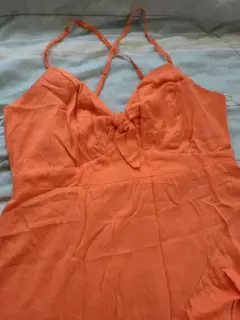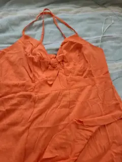 Vestido forever 21 color mandarina, menos brillante que las fotos, muy ligero y fresco. Tiene tirantes cruzados en la espalda. Es largo asimétrico abajo de la rodilla. La tela no estira, medidas pecho 112 cm, cadera 112 cm, cintura 99 cm.