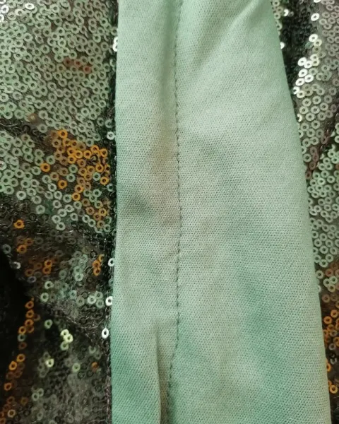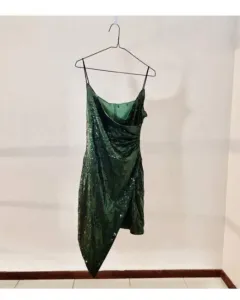 Precioso vestido color verde botella de lentejuelas, talla M a L, se ajusta al cuerpo y disimula la pancita. El vestido está forrado por dentro y los tirantes son elásticos.