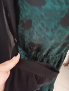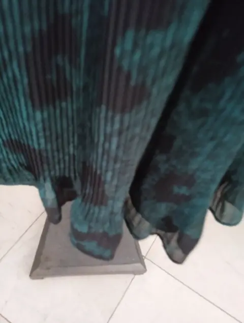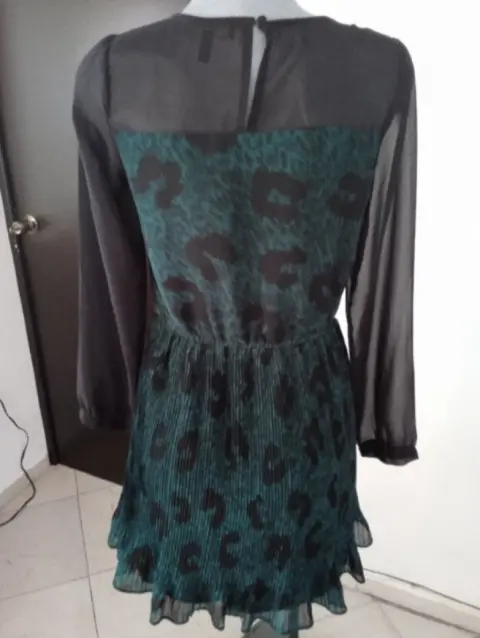 Bonito vestido animal print color verde botella y en la parte superior negro. De la cintura hacia abajo es de tablas pequeñas. Tiene fondo, pues la tela del vestido es transparente, como vaporosa. En la parte de atrás del cuello lleva botón. Queda arriba de la rodilla Dice talla L pero considero queda mejor a M. Solo se usó una vez.
