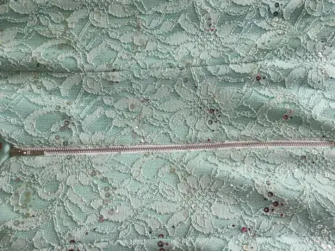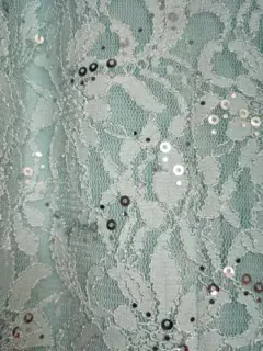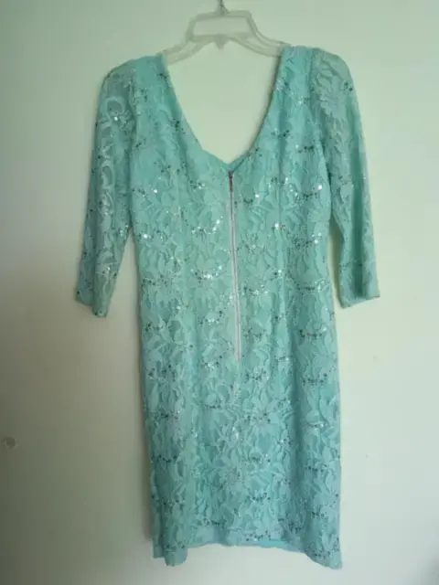 Vestido corto color verde aqua con encaje del mismo color y lentejuelas plateadas, cierre en buenas condiciones color plateado, manga 3/4 transparente