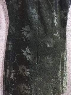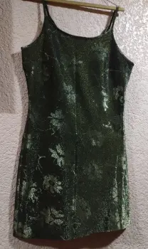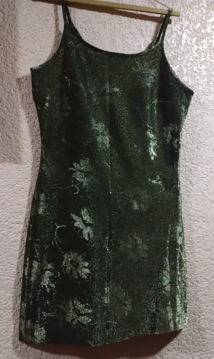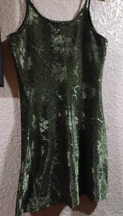 Vestido color verde con dorado todo el vestido tiene brillos Pero no se te pega a la piel, tiene detalles de flores, cómodo, no tiene ningúna anomalía, precio a tratar.
