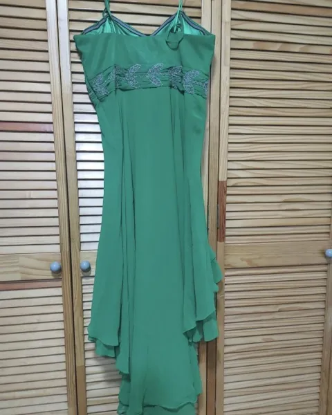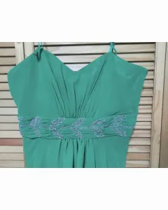 Color verde esmeralda con detalles en plateado.Strapless con tirantes delgados que lo hacen muy seguro,Tiene forro viene corto de adelante y largo hacia atrás.