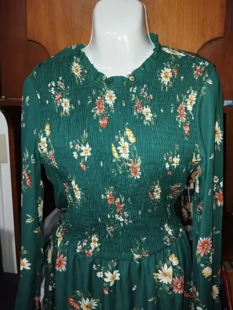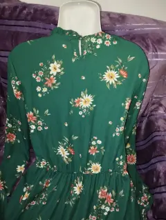 Vestido verde floreado. Hermoso vestido color verde floreado,de manga larga, tela suave fresca, cuenta en la parte superior con cuello tipo drapeado, tela tipo resorte en la parte superior, en la parte inferior cuenta con faldón y fondo detalle tipo olan, botón en cuello, y pequeño detalle de abertura súper lindo. Marcado como talla M-G, medidas en la última foto.No lo puedes dejar perder 🥰🥰🥰🥰🥰🥰☺️☺️☺️☺️👻