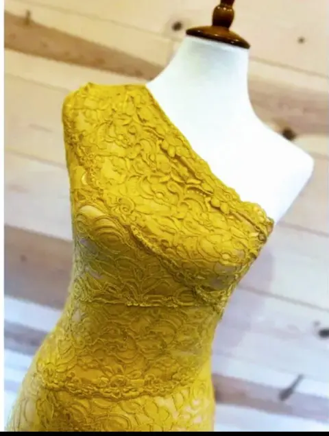 Magnifico vestido verde limón de un hombro de delicado encaje con forro color beige, talla S, completamente nuevo sin etiquetas.