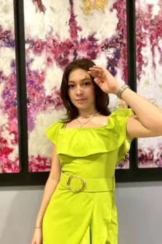Vestido verde limón con cinturón. Esta hermoso, hace muy linda figura y se ve super elegeante, es talla Mediana (viene abarcando como a una talla 5 a 9)