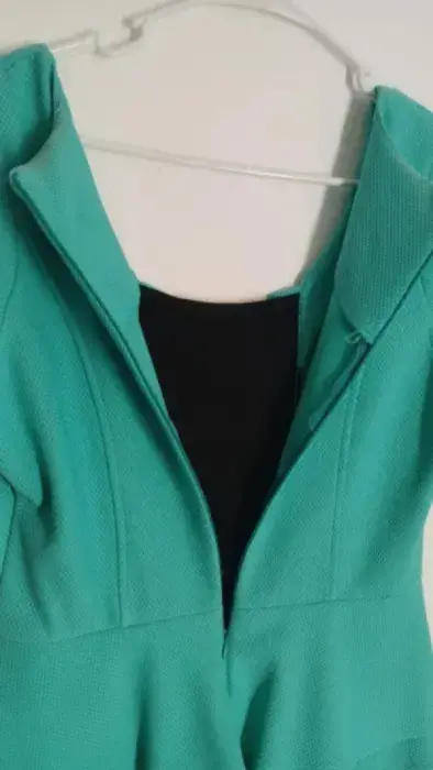 Hermoso vestido color verde menta con negro, tiene olanes a la altura de la cintura muy bonitos, queda pegado al cuerpo la tela estira y ajusta, puesto se ve muy bonito!!!