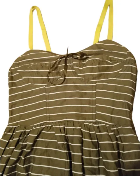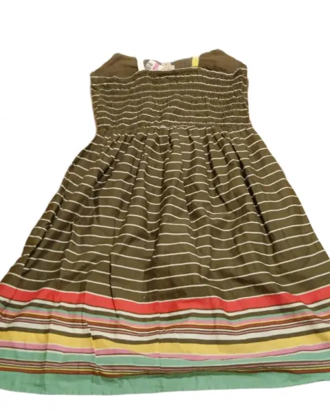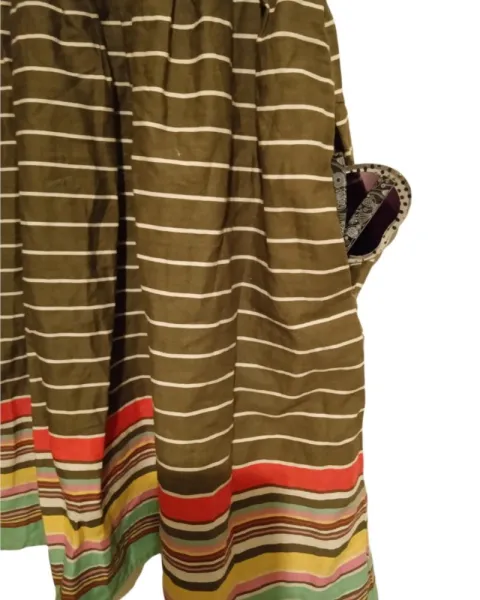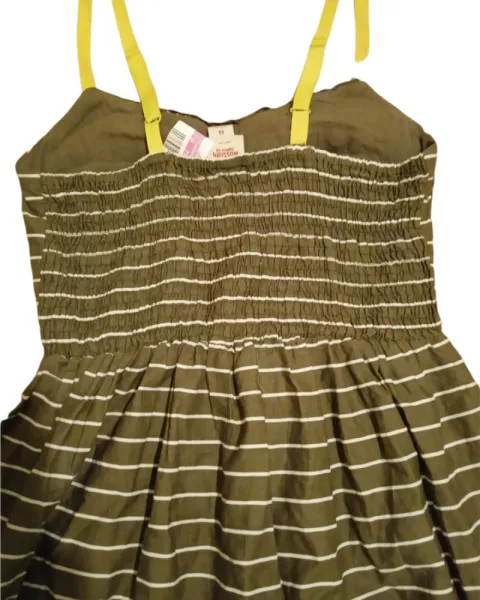 Hermoso vestido s, verde militar con líneas de colores en la falda. Tirantes ajustables. Con corte en la copa del busto y tela expándex en espalda, lo cual marca la cintura.tiene bolsillos a los costados. Es fresco. Estira muy poquito. Llega al rededor de la rodilla.