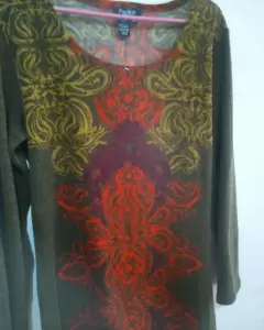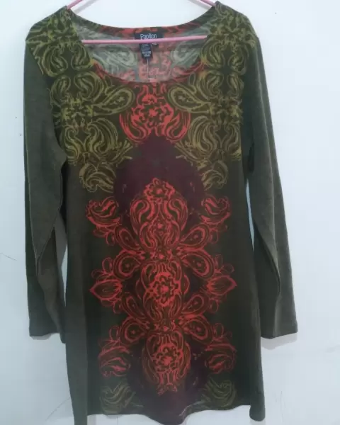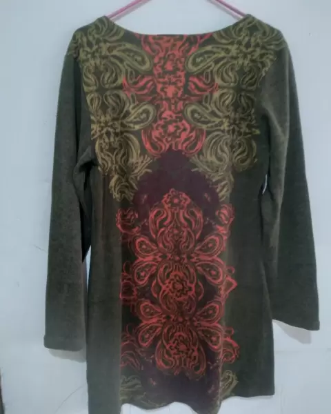 Vestido verde militar XL. Muy bonito vestido de tela calientita, para usarlo como cuando empieza a fresquear o en lugar donde está el aire acondicionado, muy moderno y colores muy bonitos diseño en color vino, mostaza, y naranja resaltan sobre el color verde soldado