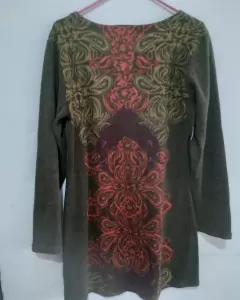 Muy bonito vestido de tela calientita, para usarlo como cuando empieza a fresquear o en lugar donde está el aire acondicionado, muy moderno y colores muy bonitos diseño en color vino, mostaza, y naranja resaltan sobre el color verde soldado