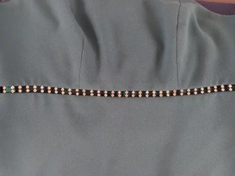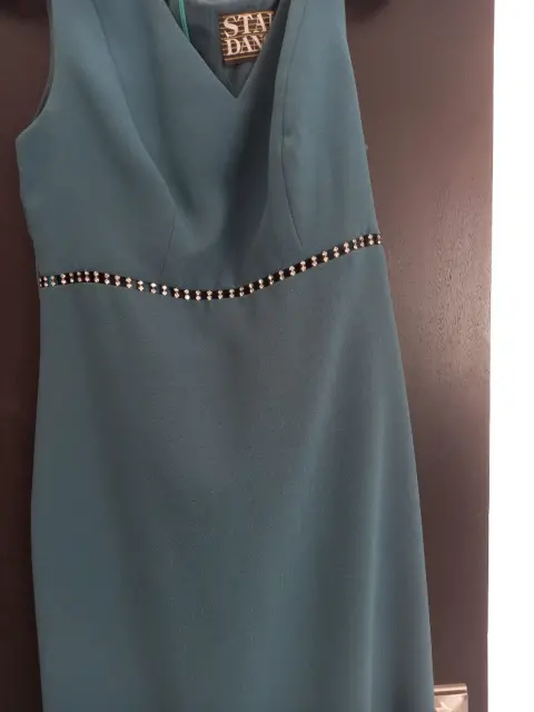 Vestido de fiesta color verde Olivo , Talla M , marca Star Dance con detalle de pedreria en talle alto