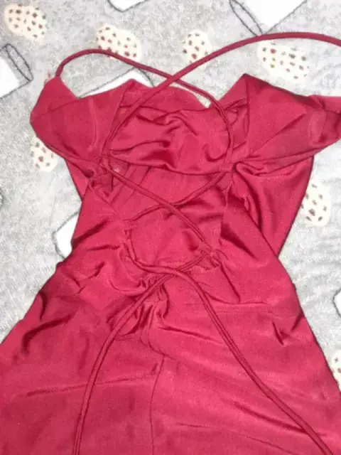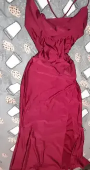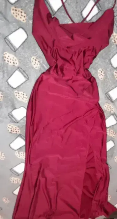 Vestido Vino para graduación. vestido de talla unitalla, largo, color vino, de muslo con abertura, escote drapeado y espalda abierta