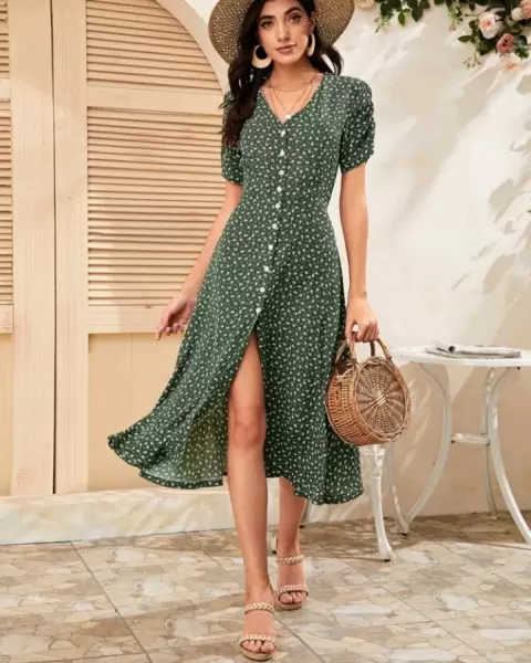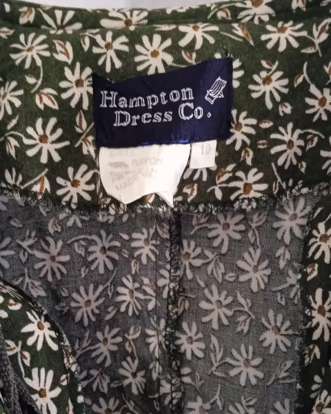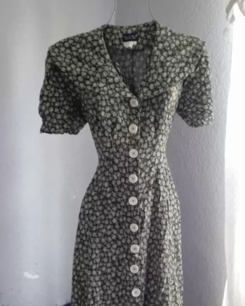 Vestido vintage. Hermoso vestido vintage auténtico de cuello y botones al frente , largo , llega a la pantorrilla color verde botella con print floral.