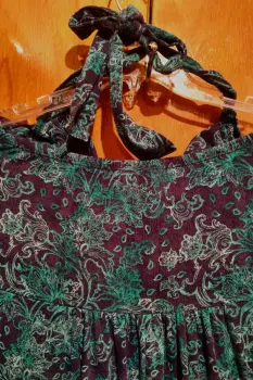 Maxivestido azul, amplio, de tirantes que se amarran al cuello. Tiene copas y elástico en la espalda. Tela flexible. Estira bastante.