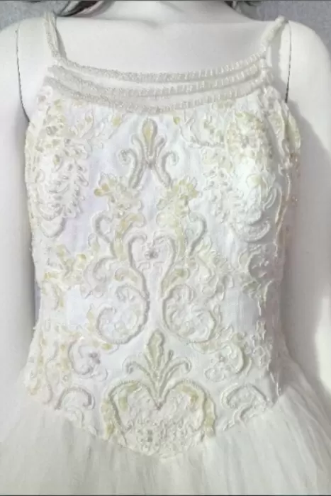 Vestido de XV años color blanco con pequeñas flores en color lila, blusa tipo corset bordado en pedreria, (esta un poco roto el tull de la parte de abajo del lado izquierdo, detalle en la ultima foto) INCLUYO la crinolina, la chalina, el cojin y la tiara,