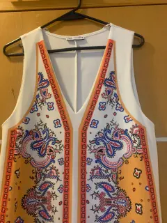 Hermoso vestido ZARA con estampado al frente, sin mangas, tiene un pequeña jalada en la espalda pero no es muy notoria, ( ultima foto) no se transparenta