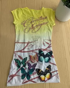 Vestido/Blusón Mariposas. Vestido manga corta, con aplicaciones de piedras en la espalda, y ligero estampado en corona, tela de algodón, altura a media pierna,sin detalles, excelente estado. Talla Ch.