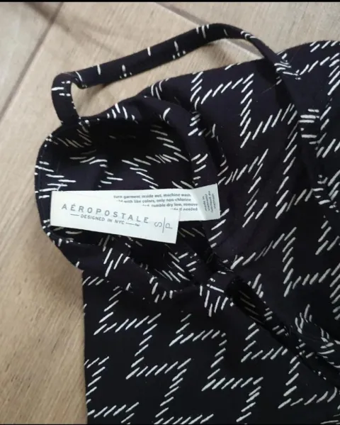 Vestidos negros Aeropostale y Shasa. Dos vestidos cortos talla chicaUno es aeropostale de tirantes y estampado de grecas Es tipo corsé tiene varilla lateral por lo que no se mueve y da más forma y falta corte AEl otro es strapless sasha super sport con falda olan super femenino perfecto para un date casual
