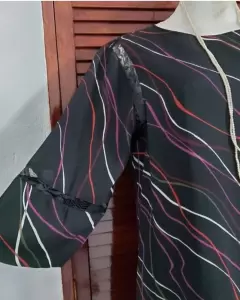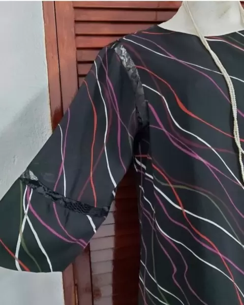 Vestido en tono negro con estampado en rayas onduladas. Talla M, no tiene strech, tiene forro al interior y no se trasluce, las mangas son 3/4 y el contorno de la axila con detalle de encaje. SIN DETALLES, NUEVO SIN ETIQUETA.