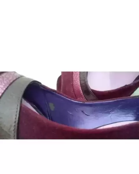 Estiletos uva 🍇. Bonitos tacones color uva, de boca de pescado con diferentes texturas son de gamuza y su tacón es en forma de pentágono. Están nuevos y fueron modificados se les quito la plataforma, tiene por dentro el detalle de que por el tiempo de no uso se pelo el forro por dentro se alcanza a ver en la última foto.