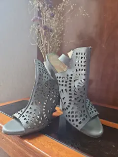 Grises zapatillas de tacón ancho, broche ajustable al talón. Marca Julio, cómodas y de vanguardia