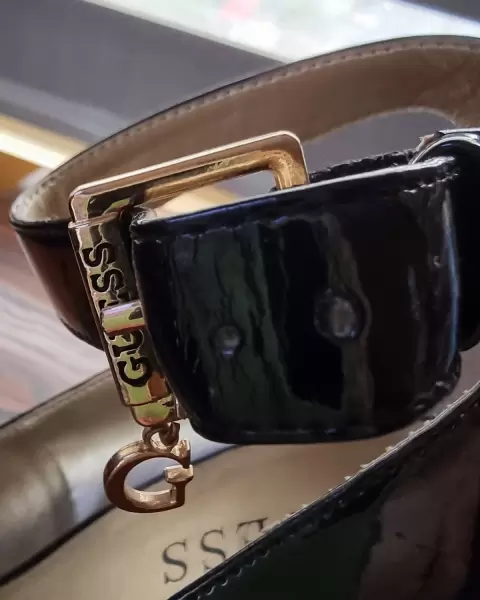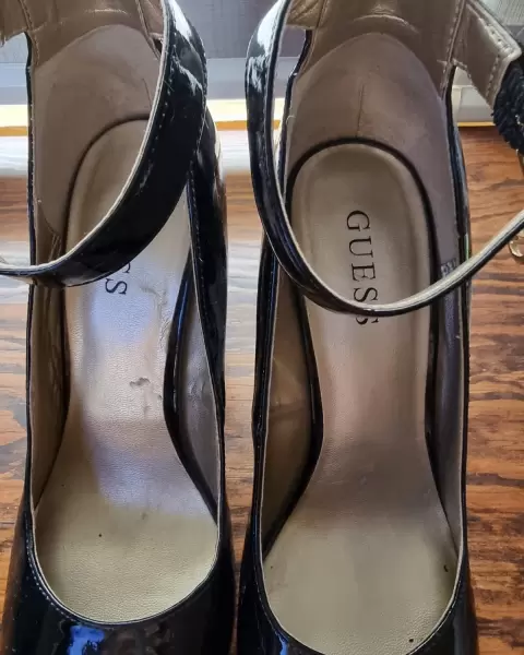 Preciosas zapatillas de charol marca Guess. El tacón es ancho, tipo Marquis, en excelente condición. La pulsera también es ancha, con el emblema de la marca en excelentes condiciones. El interior del zapato derecho, tiene una marca causada por el tiempo de guardadoEl forro del calzado es de piel y de piel sintética en color dorado.Las condiciones del calzado son excelentes, pero se han lastimado un poco por almacenamiento prolongado.