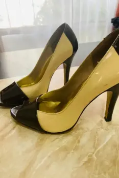 Zapatillas de charol marca PERUGIA, punta abierta, color beige con café, formales, muy bonitas y en buen estado. Son talla 3.5 pero vienen reducidas le quedan a 3.