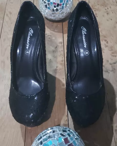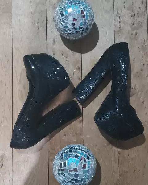 Zapatillas de plataforma color negras con lentejuela, son muy, muy altas. Estilizan muy bonito el cuerpo. La talla va desde el 6 al 7, son algo grandes. Están en buen estado.