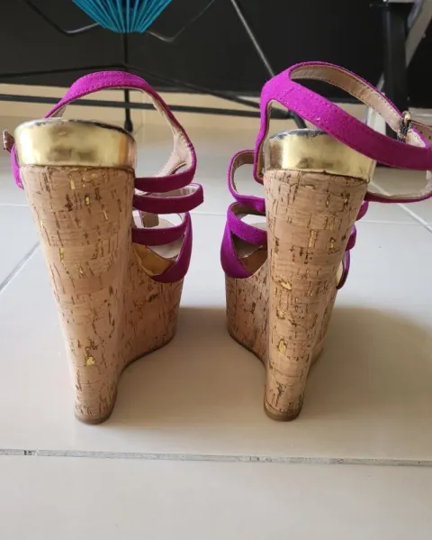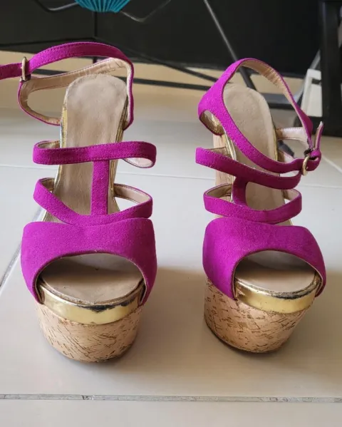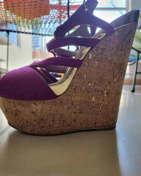 Zapatos con plataforma color lila y la plataforma es tipo caucho, son cómodos y muy lindos.Plataforma 14cmTienen 2 detalles,una de las pequeñas trabas donde se atora la correa se trono, y en la parte del frente se ve raspado, que puestos no se aprecia por la altura
