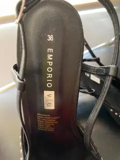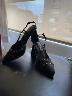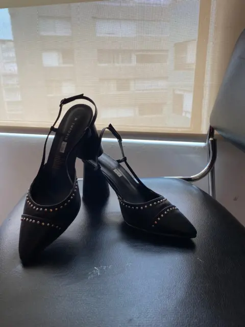 Preciosas zapatillas de tacón ancho 36 o 4. Hermosas zapatillas negras de piel con aplicaciones plateadas. Sin talón, con correa puestas solo 1 vez. Número 4 VÍA UNO