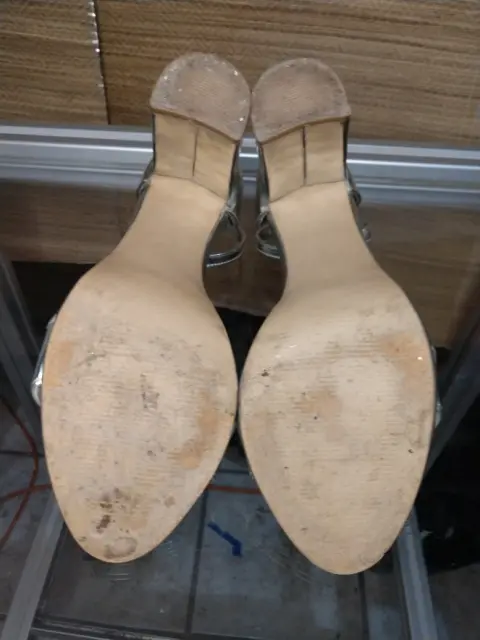 Sandalia de tacón plateada. Sandalia de tacón plateadas 4.5 efecto espejo tacón redondo en excelente estado
