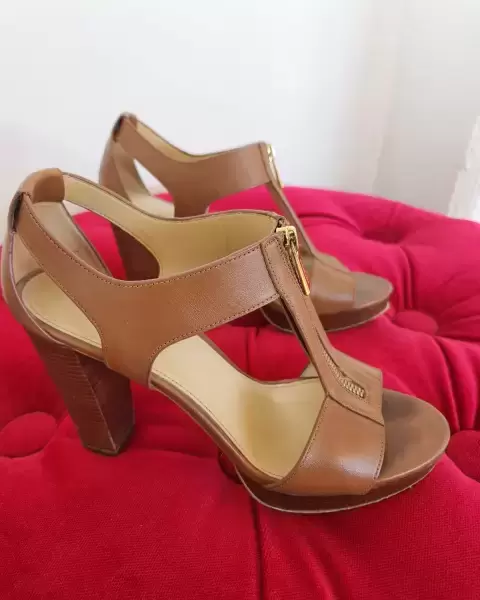 Sandalias tacón ancho Michael Kors. Sandalia Michael Michael Kors de la línea Berkley, elaborada en piel Vacheeta color champagne con punta abierta, cierre en empeine, correas en costados, tacón cuadrado y suela antiderrapante.